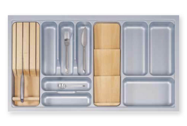 KOMBI 刀叉盤是一款多功能產品,可以精確達到所有櫥櫃尺寸要求 寬度和深度皆可調整、修飾,完美適應所有抽屜系統 使用可回收的環保材料 可搭配舉目系列木質刀架、調料瓶分隔架和調料瓶分隔片